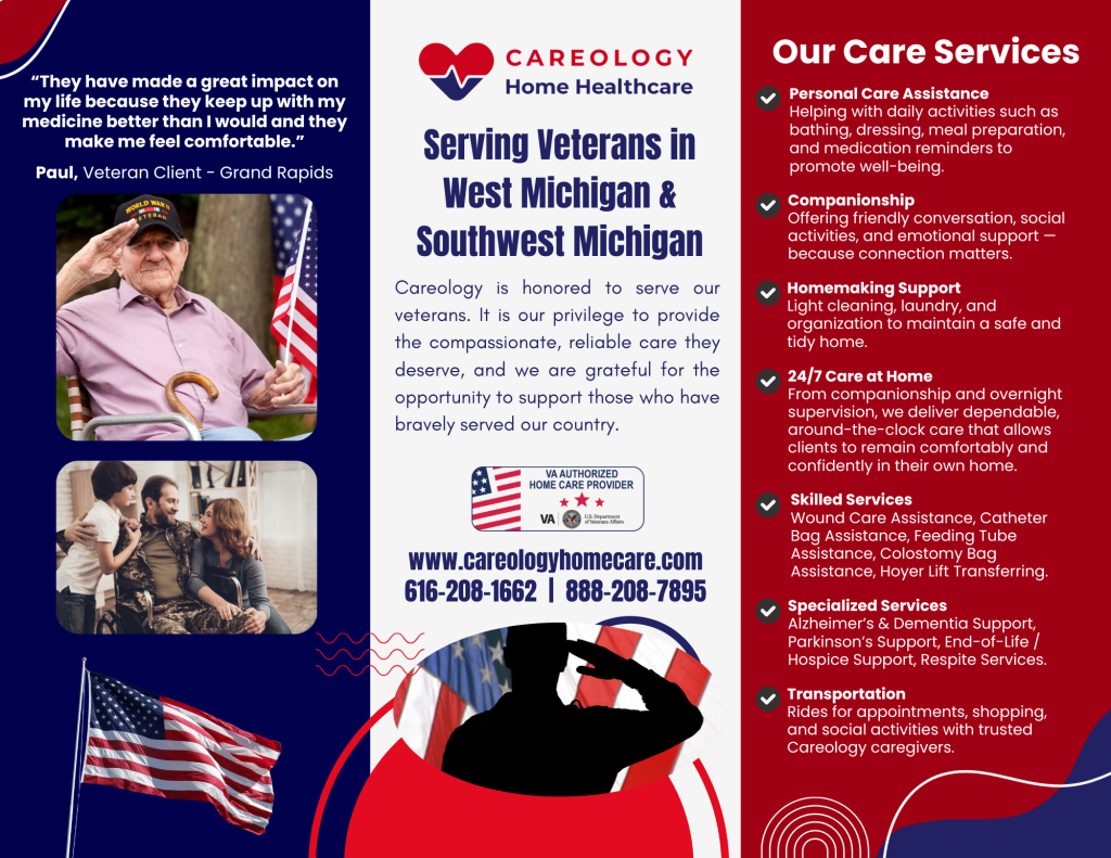 Careology is honored to serve our veterans—whether in the comfort of their own home or within a facility. It is our privilege to provide the compassionate, reliable care they deserve, and we are grateful for the opportunity to support those who have bravely served our country.
